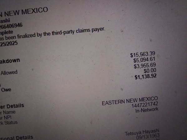 前回は私のER受診について書きましたが、今回はその受診料金について書きます。私の民間健康保険は私の勤める病院によって私が購入した保険でその病院のシステムで管理されています。私のメールを開くとそのシステムが救急救命科の受診料金を教えてくれました。なんと保険なしの計算で約25000ドル(300万円)で、保険を考慮に入れると私の負担金は1200ドル(15万円)位でした。早速私の勤める病院なので、会計係りの職員にその話をすると、職員である私その料金が割安になると告げられ、結局150ドル(2万円)くらいで済みました。私がその病院の職員でなければ、その1200ドルを払う事になったでしょう。その150ドルはコペイ(COPAY)と言われアメリカではその保険証に書かれているように、一般医で5千円、専門医で1万円、そして救急科で2万円くらいを診察前に払う必要があります。私は少しその150ドルの支払いのみで安堵しましたが、さすがアメリカ医療費はそれだけでは終わりません。ERのドクターはその病院に属するのではなく他の組織から派遣されているので、その診察料金は別途にかかると言われました。後日メールでその料金は約600ドル(9万円)で私の保険によって負担額は250ドル(3万円)と知りました。まだそれで終わりません。胸部レントゲンと頭部CTの画像診断は病院外部の会社で行われたので、その料金は別途にかかるとの事。以前の経験によると、一つの画像診断は約50ドル(7千円)だったので、今回は100ドル(1万5千円)位でしょうか?しかしそれを知らされるまでは私は安心できません。医療は人を癒す為だと思うのですが、アメリカは違います。日本の医療がうらやましいのです。